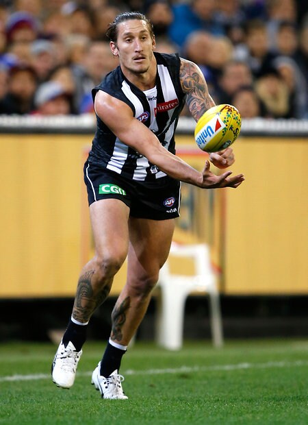 MELBOURNE, AUSTRALIA - MAY 29: Travis Varcoe of the Magpies handpasses the ball during the 2016 AFL Round 10 match between the Collingwood Magpies and the Western Bulldogs at the Melbourne Cricket Ground on May 29, 2016 in Melbourne, Australia. (Photo by Adam Trafford/AFL Media)