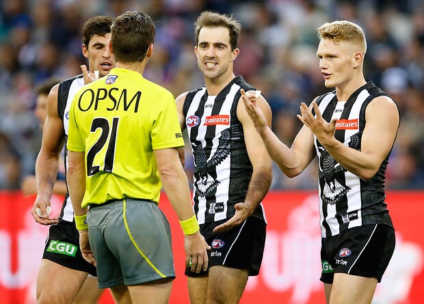 MELBOURNE, AUSTRALIA - MAY 29: Magpies players appeal to the umpire during the 2016 AFL Round 10 match between the Collingwood Magpies and the Western Bulldogs at the Melbourne Cricket Ground on May 29, 2016 in Melbourne, Australia. (Photo by Adam Trafford/AFL Media)