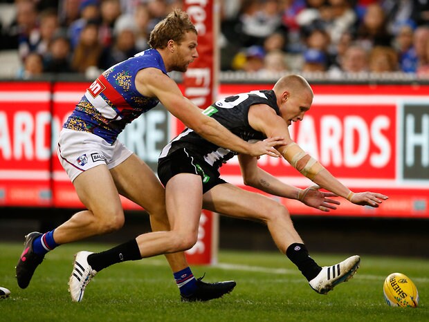MELBOURNE, AUSTRALIA - MAY 29: Lachie Hunter of the Bulldogs and Scott Pendlebury of the Magpies compete for the ball during the 2016 AFL Round 10 match between the Collingwood Magpies and the Western Bulldogs at the Melbourne Cricket Ground on May 29, 2016 in Melbourne, Australia. (Photo by Adam Trafford/AFL Media)