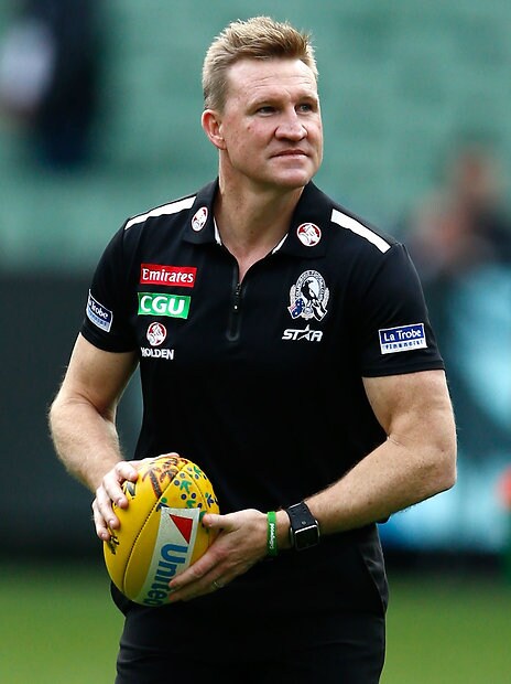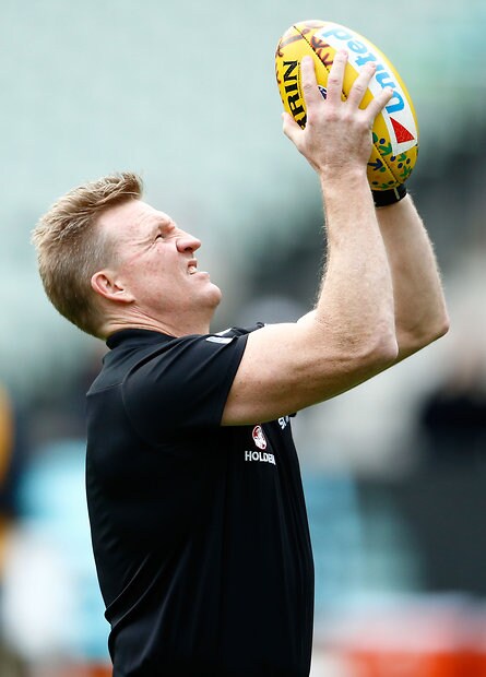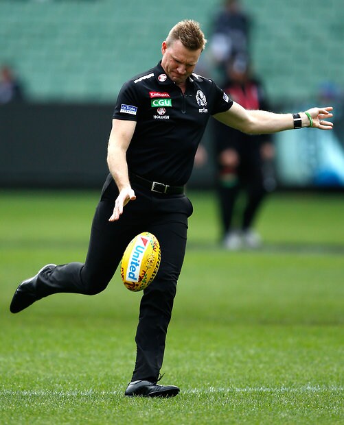 MELBOURNE, AUSTRALIA - MAY 29: Nathan Buckley, Senior Coach of the Magpies is seen during the warmup before the 2016 AFL Round 10 match between the Collingwood Magpies and the Western Bulldogs at the Melbourne Cricket Ground on May 29, 2016 in Melbourne, Australia. (Photo by Adam Trafford/AFL Media)