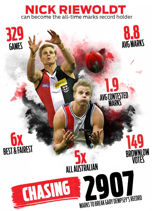 The inspirational former St Kilda captain needs just nine marks this week against Fremantle on the wide expanses of Domain Stadium to break the all-time record of 2906 held by Gary Dempsey.