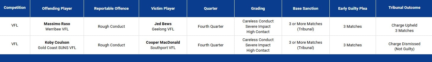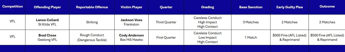 A summary of charges laid by the VFL/W Match Review Panel during the 2026 season.