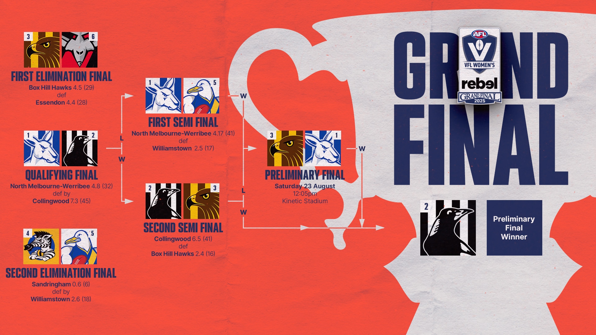 The winner of the preliminary final will advance to play Collingwood in the 2025 rebel VFLW Grand Final.