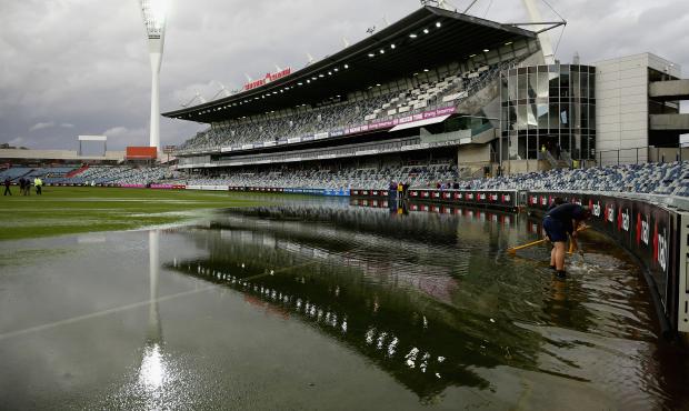 Geelong received 50mm of rain in an hour just before 6pm AEDT which flooded the ground and the stadium.