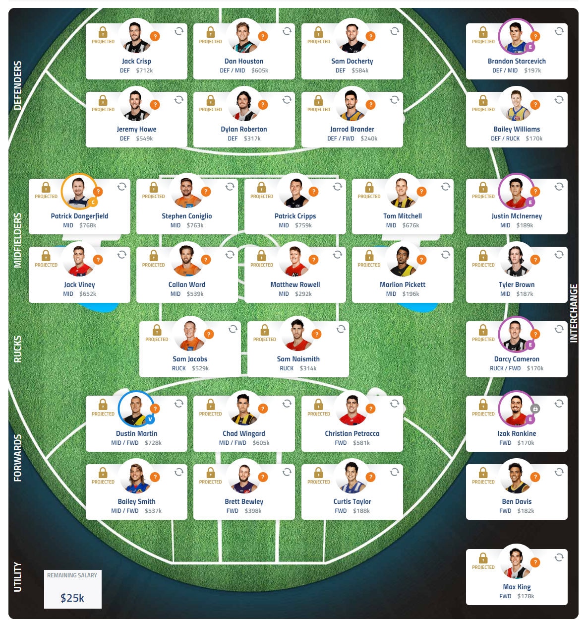Value can also be found in the forward line in a player like Lachie Whitfield (MID/FWD, $829,000) who managed just 68 in his first game. By trading him down to Dustin Martin (MID/FWD, $728,000), this will leave you with $101,000 in the bank and a player who has two handy Thursday night games in the next four weeks.